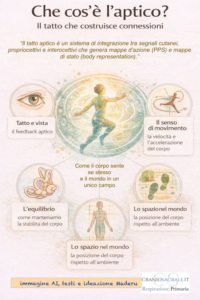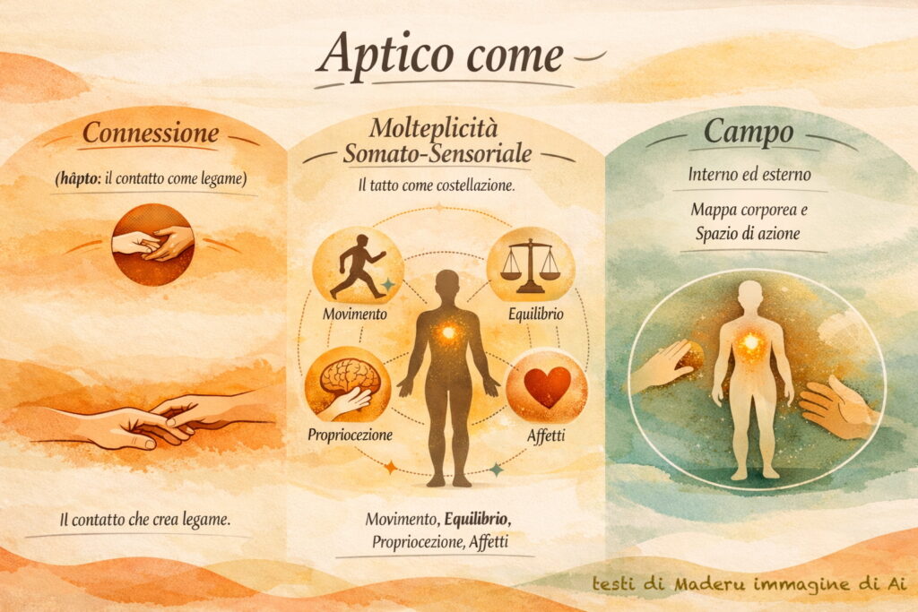 Quindi “aptico” non riguarda solo la pelle: diventa il nome di una matrice somato-sensoriale che include vista, equilibrio, movimento, postura, mappa del corpo e rapporto spaziale col mondo.