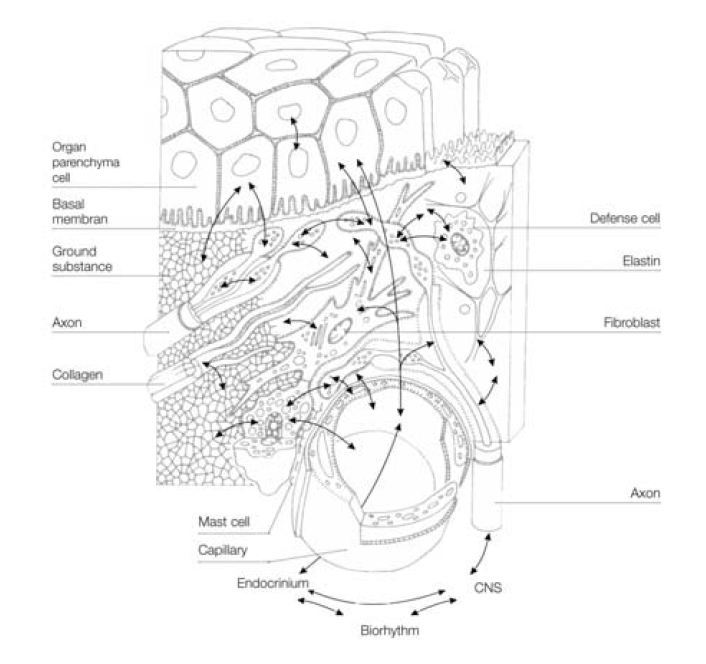 La cellula vivente, sia che faccia parte di una struttura organica, e sia innestata su una membrana basale, sia che agisca singolarmente rispetto alle altre cellule della struttura, sarà sempre circondata dalla matrice. Questa matrice è un sottile filtro biofisico strutturato, tridimensionale che controlla la trasmissione delle sostanze nutritive e dei prodotti di scarto della cellula, dei mediatori e di qualsiasi altra sostanza presente nell’ambiente cellulare. Nessuna sostanza può passare direttamente dalla circolazione sanguigna alla cellula e viceversa. Persino i neurotrasmettitori rilasciati da una cellula nervosa devono raggiungere la cellula attraverso la ECM.