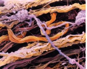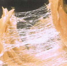 Un ingrandimento della miofascia: lo “zucchero filato” sono fibre collagene endomisiali che avvolgono e fasciano completamente le fibre muscolari carnose.